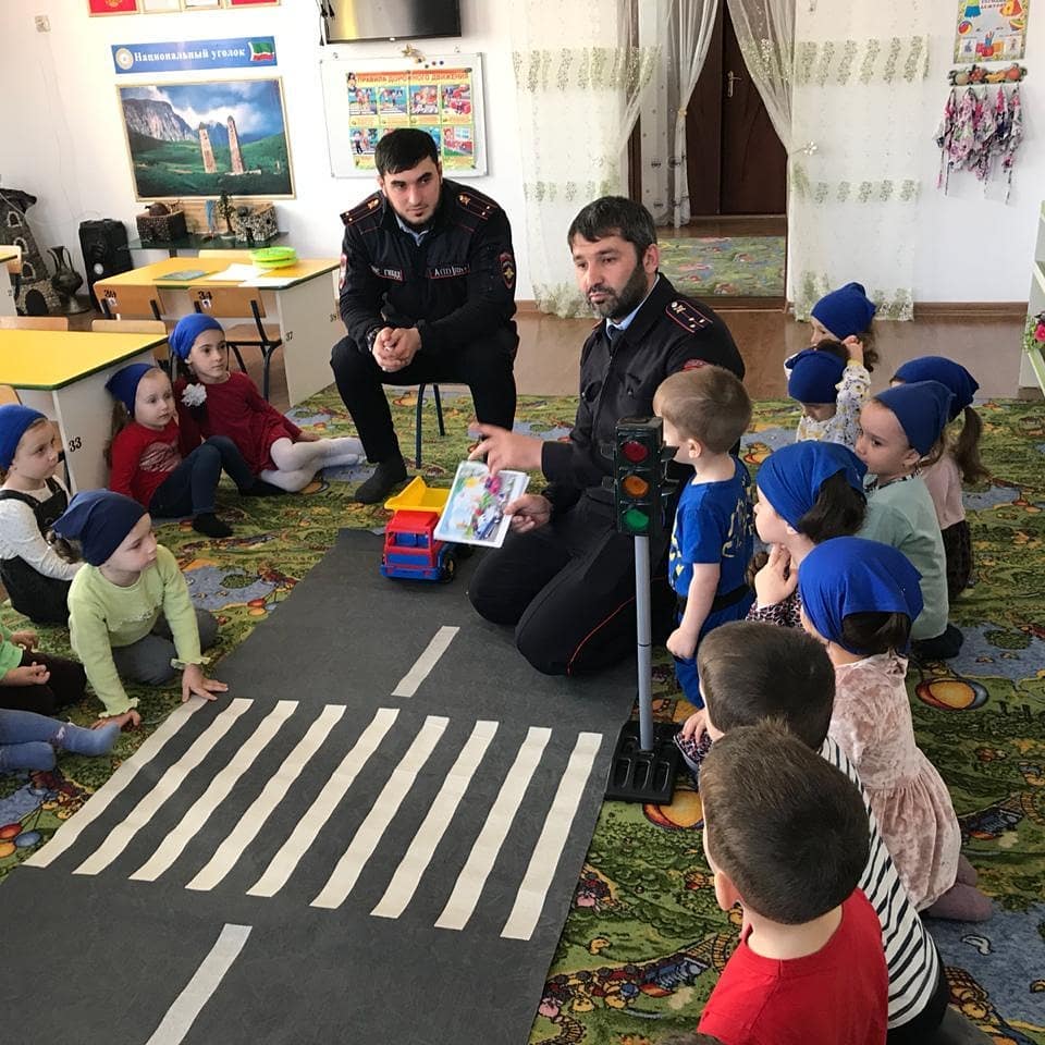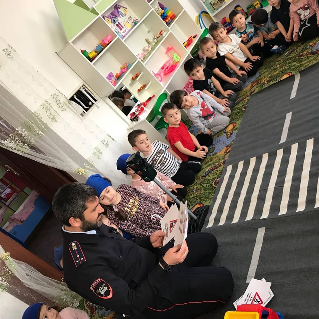 МБДОУ Д/С_5 «Ровда» г. Урус-Мартан. В ходе проведения беседы с воспитанниками, были рассмотрены дорожные знаки, которые встречаются им на пути следования в детский сад, а также проведены профилактические беседы о недопустимости игр вблизи проезжей части дороги. Инспекторы напомнили и о применении юными пешеходами световозвращающих элементов на одежде в тёмное время суток, объяснив, что эти приспособления делают пешехода на проезжей части более заметными для автомобилистов.